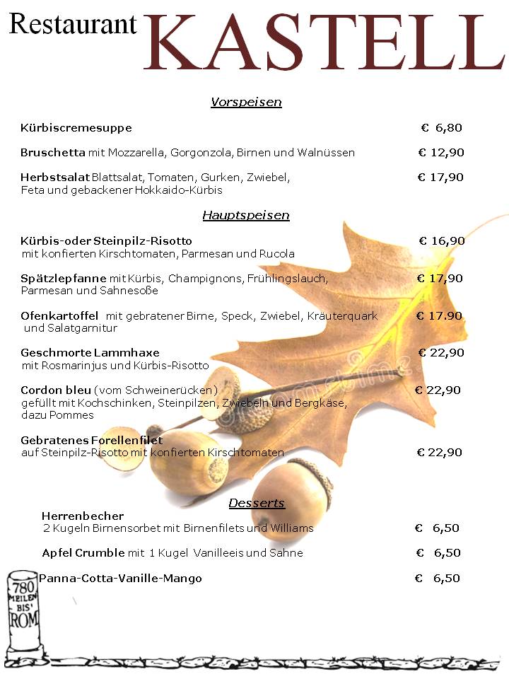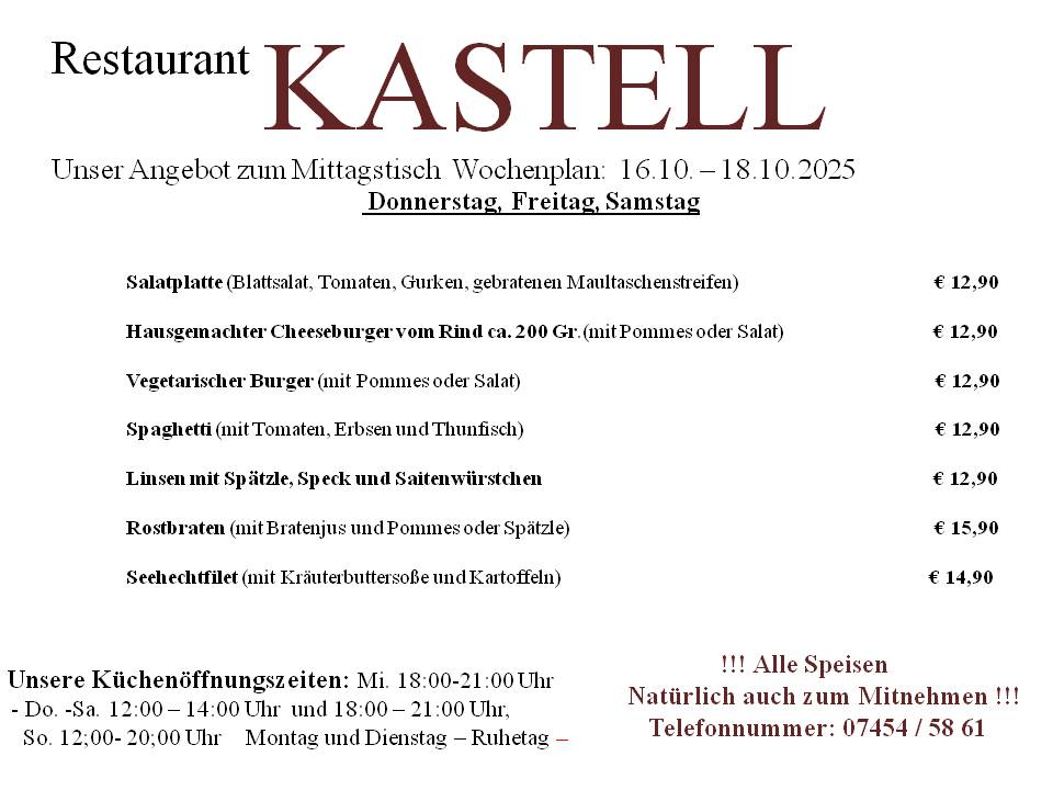 Am besten reservieren Sie heute noch einen Tisch. Wir freuen uns auf Sie. Kontaktieren Sie uns dafür einfach per E-Mail unter restaurant_kastell@t-online.de oder telefonisch unter +4974545861.