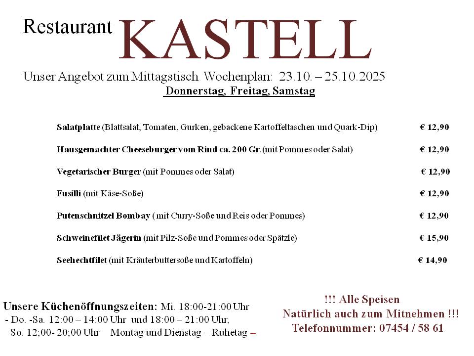 Am besten reservieren Sie heute noch einen Tisch. Wir freuen uns auf Sie. Kontaktieren Sie uns dafür einfach per E-Mail unter restaurant_kastell@t-online.de oder telefonisch unter +4974545861.