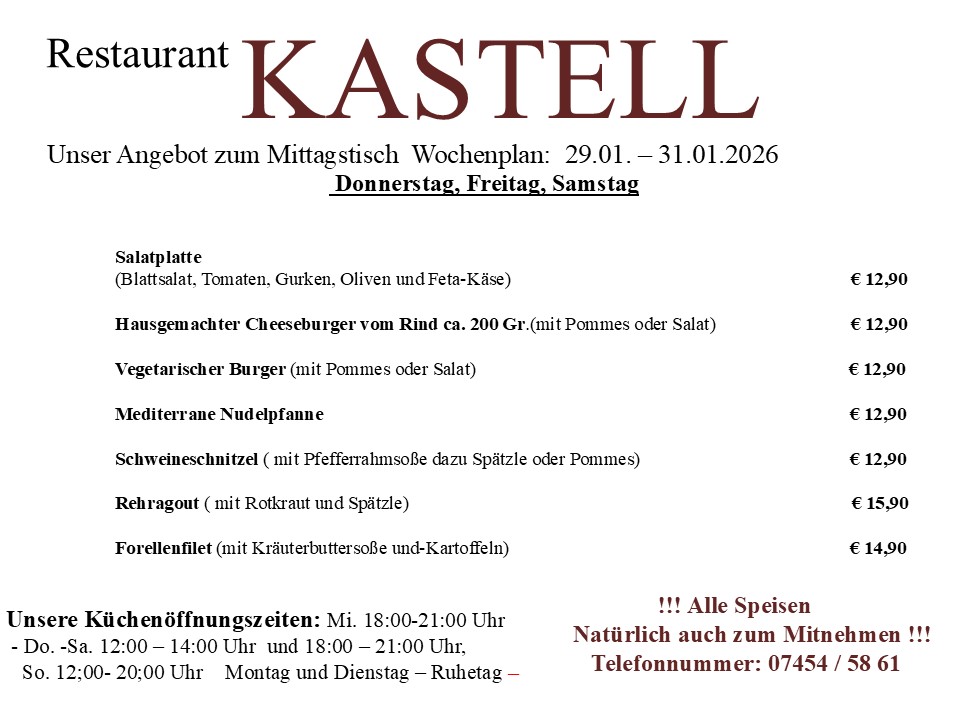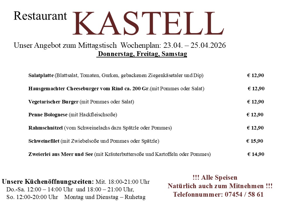 Am besten reservieren Sie heute noch einen Tisch. Wir freuen uns auf Sie. Kontaktieren Sie uns dafür einfach per E-Mail unter restaurant_kastell@t-online.de oder telefonisch unter +4974545861.