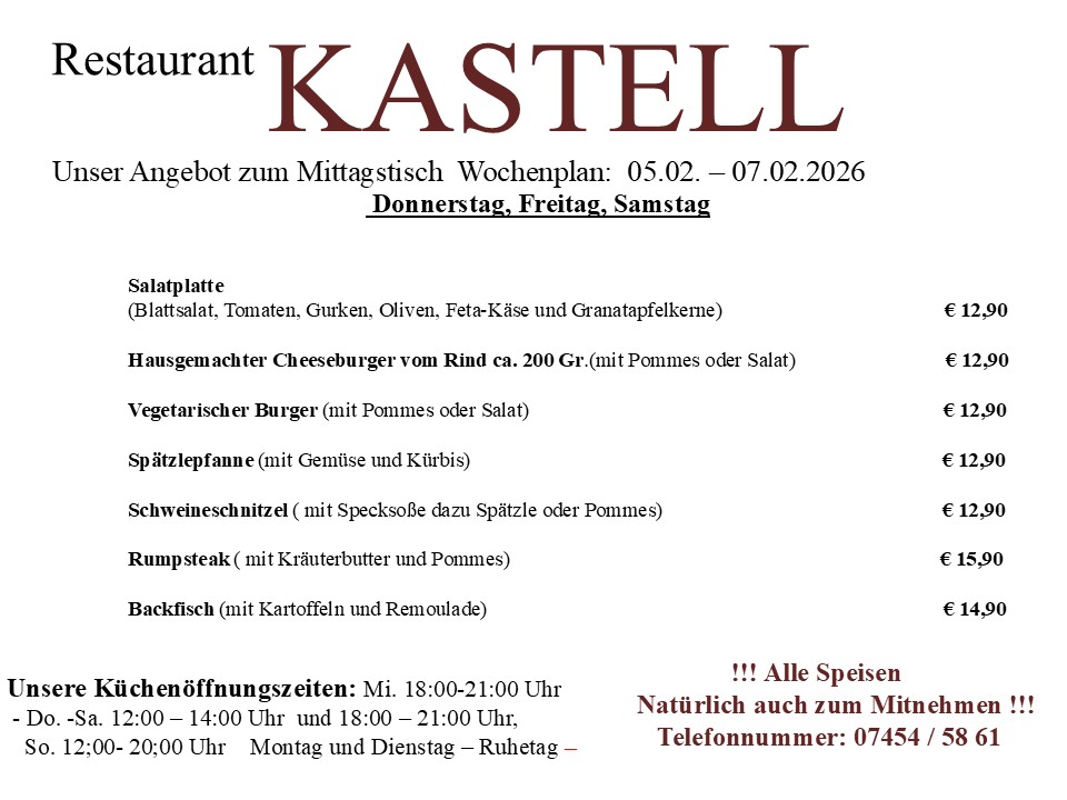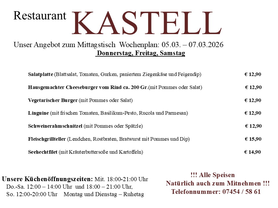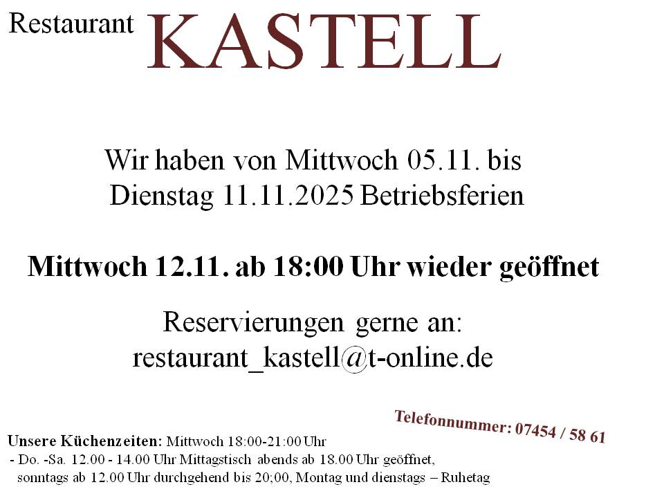 Am besten reservieren Sie heute noch einen Tisch. Wir freuen uns auf Sie. Kontaktieren Sie uns dafür einfach per E-Mail unter restaurant_kastell@t-online.de oder telefonisch unter +4974545861.